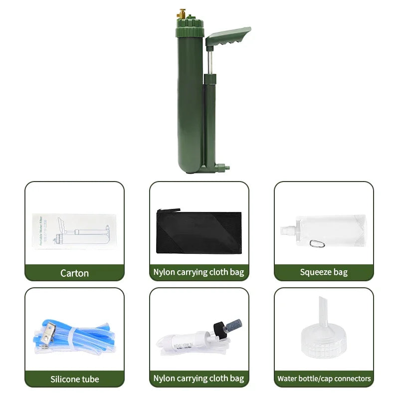 * Unique Design Handle & Stainless steel Piston Rod :Ergonomic design handle for less push effort,Reliable &Never Broken.Water inlet and outlet Have Non-Slip Undercut,Support For Normal Usage and Back wash. FOOD GRADE MATERIALS: Main Body ABS Material,Poly sulfone Medical Grade Ultra Filter,BPA Free, Comes with internal RO filters,Water pouch and Silicone tubing, Travel Bag, Manual Book.