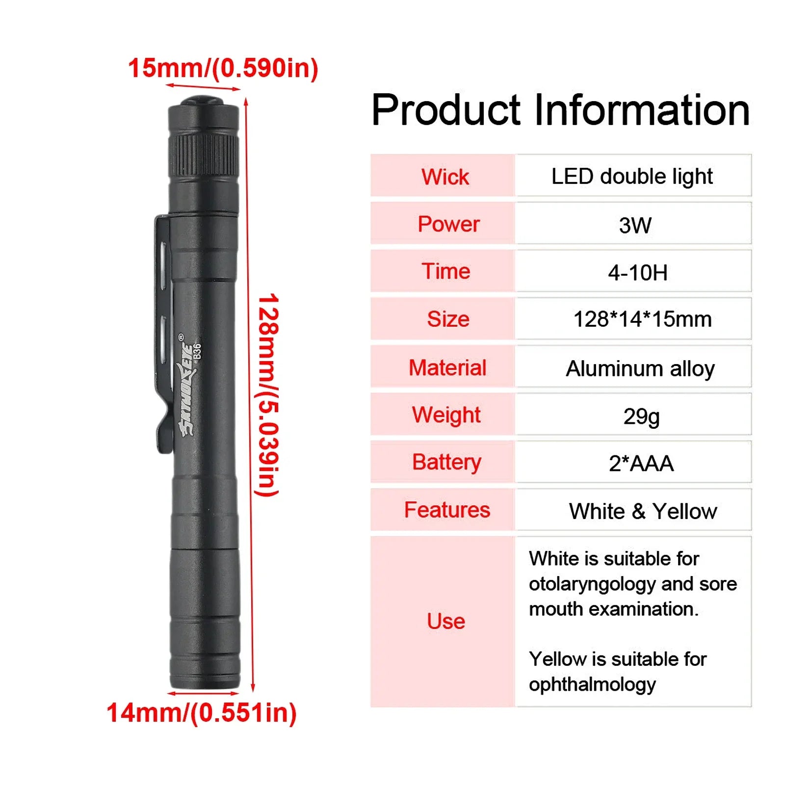 * pen light, white light is clear and suitable for ENT, sore mouth examination